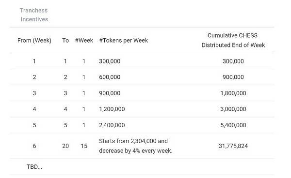 而流动性挖矿部分的 CHESS ,将在 4 年内以累加的方式在 PancakeSwap 和 Tranches 上分发。譬如第 1 周分发 30 万个,那从第 2 周到第 4 周,每周在上一周的基础上再分发 30 万个代币,那到第 4 周结束时,累计分发量将达到 300 万个,第 5 周分发量则为 240 万个,此后每周环比上周递减 4%,以此循环,详细的分发时间表如下: