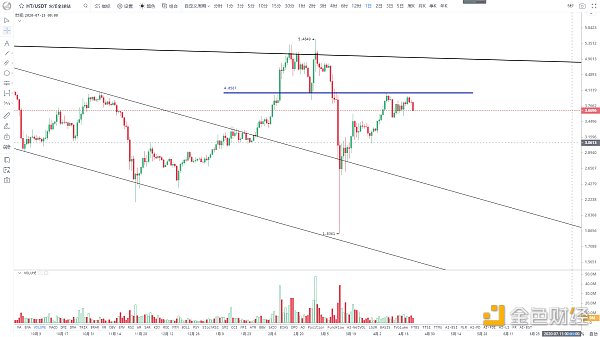 LTC整体相对其余主流币较为弱势,已经跌破30日均线支撑,下方短期支撑40日均线,这个位置一旦再破位,继续下探将是大概率,技术图形上,目前价格已跌回至前期下降通道,今日反弹量能一般,持续性不强,短期还有回落的风险,支撑38美金,压力42美金。
