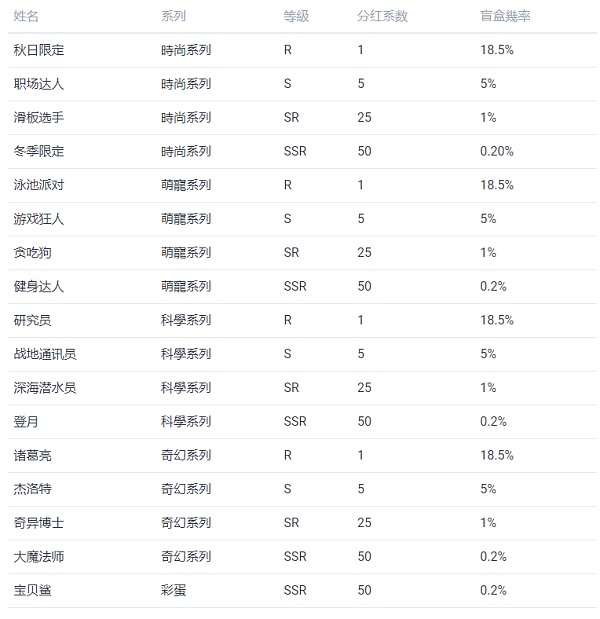 种类:四个系列,分别是时尚系列、萌宠系列、科学系列、奇幻系列,每个系列又有4个等级,分别是R、S、SR、SSR;
