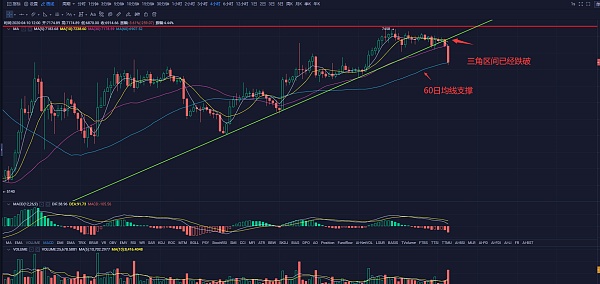 4小时线也是我们对本周剩下行情不乐观的原因之一。目前,4小时线已经跌破三角区间,下方仅有60日均线支撑,整体形势不容乐观。所幸,我们在该位置可以抱有两点期待,一是前期在该位置附近有部分多单筹码支撑。二是在刚才急速下挫时成交量迅速放大,除了快速出逃的筹码还有介入的部分抄底筹码。