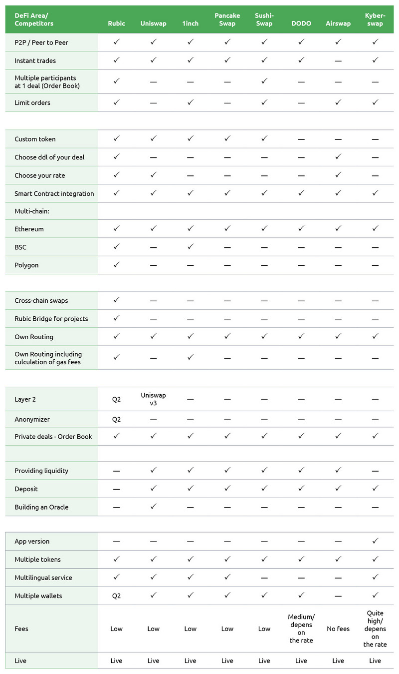 如下图所示,Rubic希望在以下这些功能中和普通DEX形成差异化:跨链、Online Support(在线客服)、Multiple participants at 1 deal(一笔交易支持多个参与者,如「一键发工资等场景」)、自定义限价单的交易费用和终止日期、Private deals(隐私交易)等。