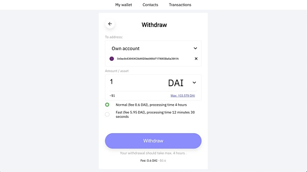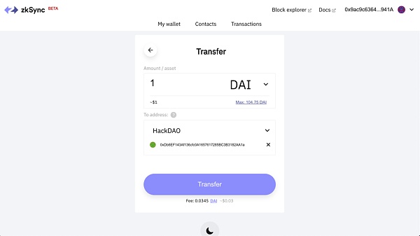 这个页面显示了你的账户在 Layer2 的资产。当然,你也可以在 ”Contacts“ 中添加联系人,以及在 ”Transactions“ 中查看交易记录:? ? ? ??