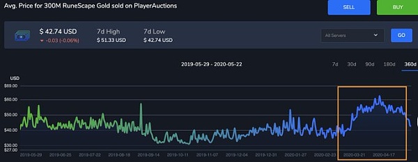 每个月从大规模的黄金销售业务中产生的利润高达5万美元。Mod MMG在一次采访中表示,《Runscape》每个月都有40%-50%的活跃玩家从非法的游戏内货币经纪人渠道购买黄金。淘金主要是由第三方引导软件完成的,但许多现实世界的经营继续存在于委内瑞拉、巴基斯坦等较贫穷国家。更重要的是,这些服务的运营者从新冠肺炎带来的封锁中受益。在2020年3月和4月,游戏中的黄金(RSGP)价格按美元价值计算升值了50%,因为封锁期间需求飙升。如果这一直是一个流动性强、可交易的市场,投机者可以在上面押注,而不用担心被禁止或者被RSGP交易商,那会怎么样?