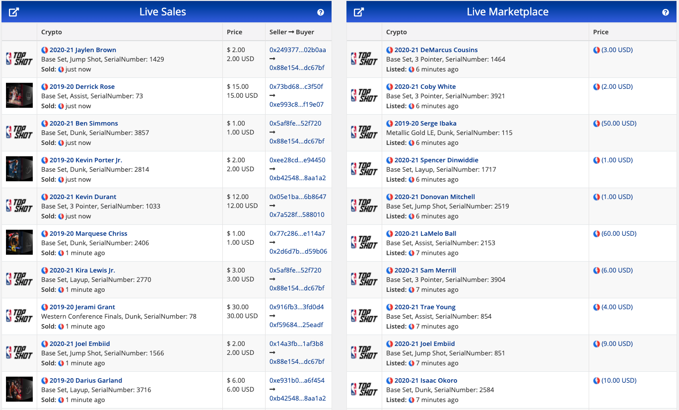 而实时销售和实时上架的数据统计几乎都被 NBA Top Shot 包揽,几乎每时每刻都有新的藏品被上架、卖出。