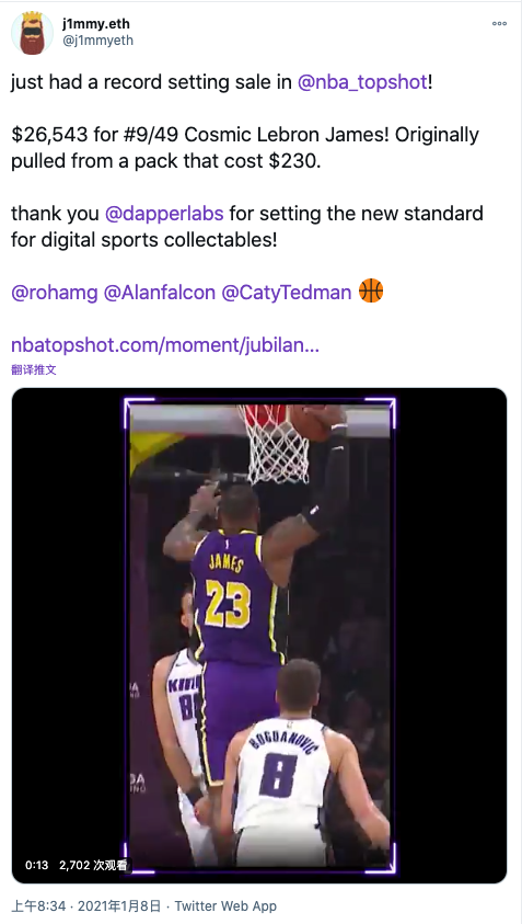 NBA Top Shot 目前最高成交额纪录是 26543 美元,精彩时刻的内容是勒布朗·詹姆斯的暴扣,而这张卡牌出自售价仅为 230 美元的卡包,投资回报率高达一百余倍,令人瞠目结舌。