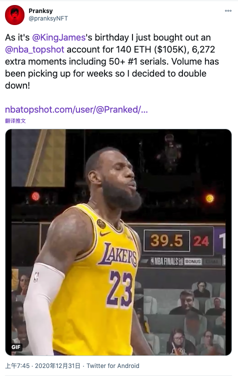 NFT交易员投入140ETH购买NBA加密收藏品 以庆祝詹姆斯生日:当地时间2020年12月30日,NFT交易员Pranksy在推特宣布,他投入140 ETH (当时价值10.5万美元)购买大量NBA授权NFT代币(6272个额外时刻,包括超过50个#1系列),以此庆祝勒布朗·詹姆斯(LeBron James)生日。
