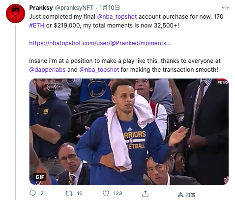 Pranksy 购买这些账户共花费 463ETH,按照他购买账户时的价格计算,约合 51.8 万美元。而 Pranksy 拥有的精彩时刻总数已经达到了 3.25 万个。