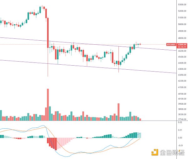 4小时突破近期下降趋势通道,并进行了回踩测试,不过量能并未有效放大,所以短期走势较为平缓,只要不破后面大概率将继续上攻,日线支撑46000美金,主要压力48500-49000区间。