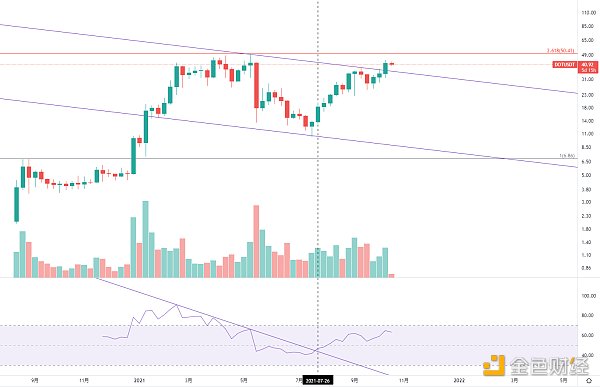 DOT周线已突破前期下降趋势通道压制,大方向有望保持震荡向上的姿态,上方关键压力在2.618 50美金一带,也是前期顶部区域,后面若能蓄力突破,那么V形反转确立,下一步将会迎来更加强势行情,周线支撑36美金,回落可适量低吸。