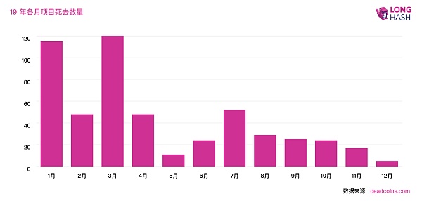 持续了一整年熊市的 2019 年,大量项目出于各种原因慢慢退出人们视线。通过爬取 DeadCoins.com 的数据,我们发现了一些挺有意思的现象。至少从上述网站来看,2019 年死去的区块链项目已经明显少于 2018 年。