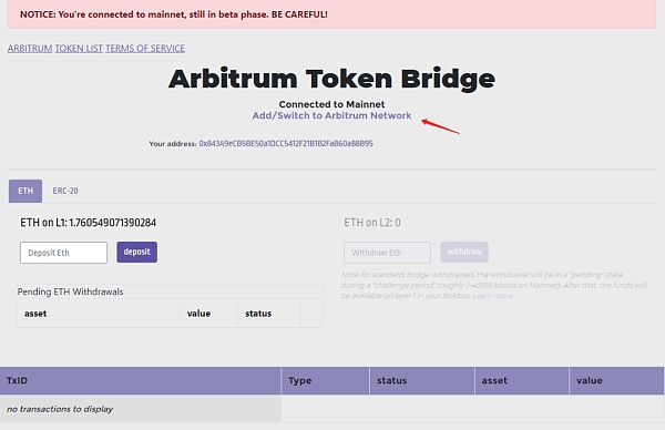 到官方的跨链桥https://bridge.arbitrum.io/,点击页面中间的“Add Switch to Arbitrum Network”,实现一键在线钱包加入Arbitrum网络。也可以自己手动在小狐狸上添加网络。