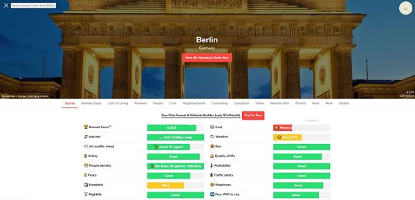 宜居程度得分:德国首都柏林的宜居程度得分高达4.31 分。这是因为柏林有着飞快的互联网接入速度,足够的安全性,丰富的夜生活,言论自由,对英语的接纳程度高,对 LGBT 等少数群体友好的基础设施等优势。