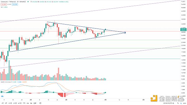 目前LINK日线也是上穿近期三角压制线的状态,指标线低位金叉,有效突破后续继续上攻将是大概率,近期压力在32美金附近,这一带突破也将形成符合双底,量能配合继续向上挑战前顶37美金强压也将成为可能,目前大方向仍是多头趋势,短期支撑28美金,趋势支撑23.3美金,不破中长线可以持有。