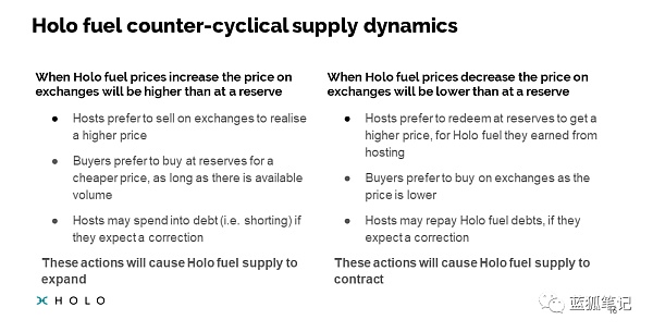 Holofuel将可以直接通过法币从Holo“储备账户”购买,但它会在外部市场上交易,这些市场有剧烈价格波动。HoloFuel的供应量由网络代码通过算法来控制,这样做可以减轻外部市场的波动性。当考虑HoloFuel和价格时,需要考虑三个方面: