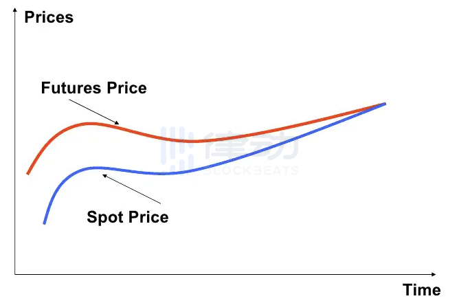 由于套利所占用的资金具有时间成本,导致套利活动无法一直进行到期货与现货价格完全相等。从下图我们可以看出,离最终到期日的时间越远,期货价格因受资金成本影响,而与现货的价差就越大。这导致期货价格在未到期时会轻微偏离目标价格,使得期货合约的真实构造函数从目标 y = x,变成了实际的 y = x + c(c 代表无风险利率的风险敞口)。