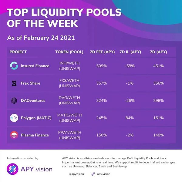 为了计算上周的最高收益池,APY.vision采用最近7天的平均年化收益(APY)和过去一周的无常损失,最终来计算总的平均回报。需要注意的是,参与比较的池子,规模至少要达到500万美元。