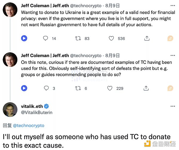 而对普通的加密用户也同样如此,当我们遇到要向特定组织和国家匿名捐款,或支付敏感的医疗费用等情况时,隐私工具就体现出了它的价值,只不过是此类情况并不常见罢了。9 日,Vitalik 为了支持这一观点,还在 Twitter 上公开声明自己曾使用 Tornado Cash 向乌克兰捐款。