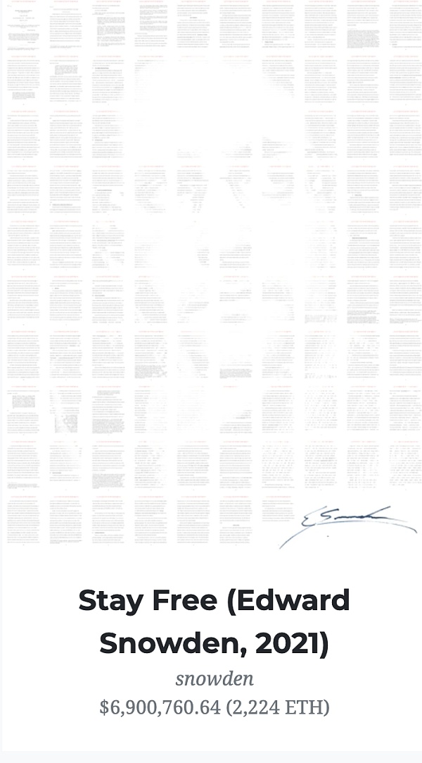 Foundation在2021年2月上线,是几大平台里上线最晚的一个,但它上线当月交易额便直接进入百万,3月达到千万,4月其他市场交易额缩水时逆势新高,5月超过其他交易所仅次于Nifty。Foundation的选品独具一格,它拍卖了Edward snowden的《Stay Free》、《THE NEW YORK TIMES》极具艺术感的系列,以及加密圈情怀作品彩虹猫。