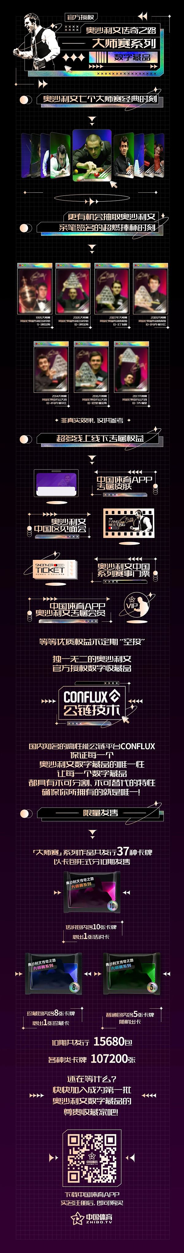 2021 年 10 月 29 日,由斯诺克传奇球星罗尼·奥沙利文独家授权,「中国体育」zhibo.tv 联合国内知名的高性能公有链平台 Conflux 推出的《奥沙利文传奇之路》-[大师赛]系列数字藏品正式上线!这也是台球领域的第一款数字藏品。