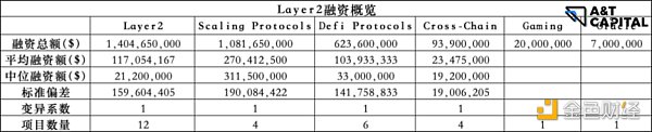 总体数量太少,不具有统计意义。总体来说,Layer 1 & Layer 2 属于融资额度高,赛道火热。按照技术流分项目的话,融资额度相差不大。