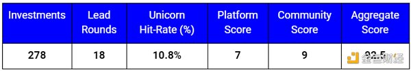 社区评分:[权重:7.5/10]社区对web3来说非常重要,该指标主要评估基金在设计、培育和扩大社区影响力方面的能力,这包括写作、社交媒体传播、播客、会议座谈、twitter space、一般社区参与和思想领导力。我们会考察这些由社区驱动的倡议数量、质量和覆盖面,以便通过社交平台以及基金网站和、媒体来确定评分