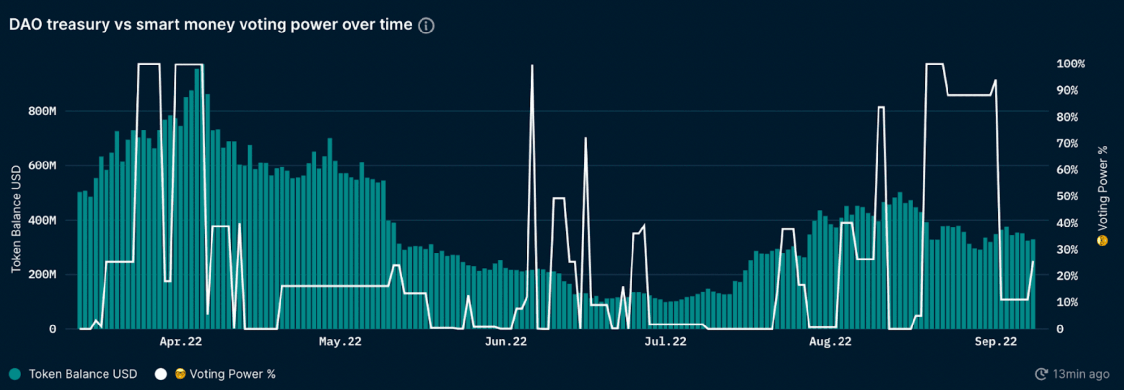 下图是显示 Smart Money 投票权和 DAO 国库余额随时间变化的图表。
