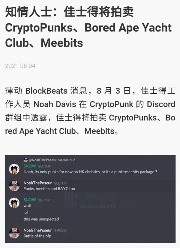 2021年8月6日,佳士得官方发布公告,将于9月17日开启NFT拍卖,拍卖标的正是Cryptopunks、BAYC与Meebits,当时,BAYC地板价格已升至15ETH,猿猴宠物地板价达到2.8ETH。