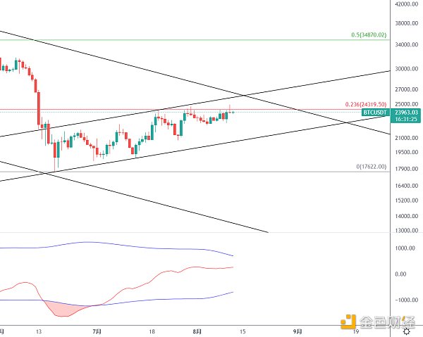昨日BTC冲高至25000附近遇阻回落,日线收线也未能站上24300上方,最低跌至23700-23800短期支撑区间止跌反弹,不过整体仍是低点抬高而高点创新高的多头趋势,短期冲不过去不代表后面过不去,趋势上行周线支撑仍是23000-23200。