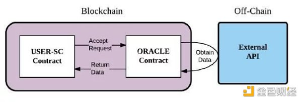 预言机的工作机制可以概括为:有使用数据需求的用户智能合约(User-SC Contract)向预言机合约请求数据,预言机从外部数据源 API 获取数据后,汇总处理后返回一个加权结果给用户智能合约。