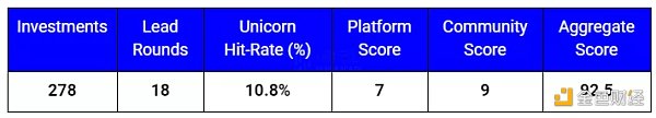 社区得分:[权重:7.5/10] 这是衡量 Web3 重要性的独特指标--社区--以及该基金在设计、培养和扩大社区方面的能力。这包括写作、社交媒体覆盖率、播客、会议、Twitter Spaces 和一般的社区参与和思想领导。我们查看这些社区驱动计划的数量、质量和覆盖面,以便通过社会和传统媒体来源以及基金网站和/或媒体来确定得分。