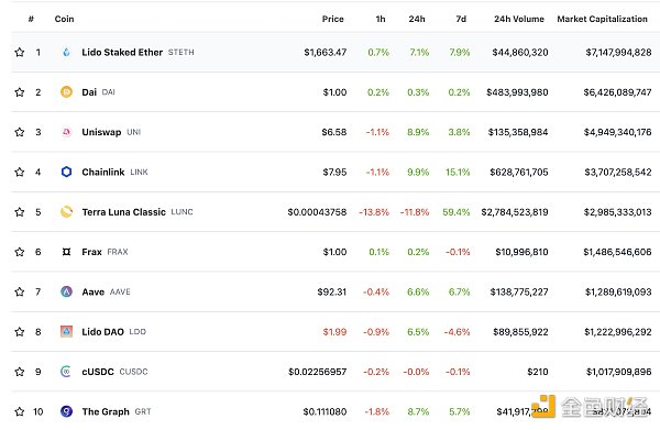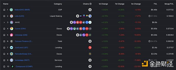 DeFi项目锁定资产前十排名及锁仓量 数据来源:defillama