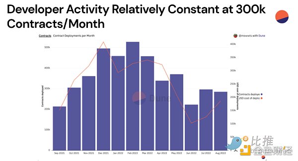 解读:在开发层面上,每月 30 万个智能合约可能还包括重复造轮子和仿盘等行为。笔者建议更多的看代码质量和认可度数据(比如 Github 上的点赞和收藏数据等)。