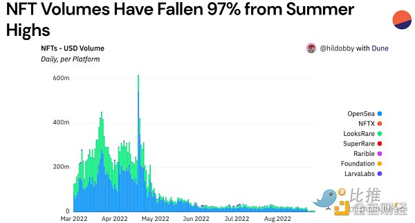 解读:一个早已知晓的宏观事实。但数据图表呈现的更为直观:图中曾一柱擎天的蓝色代表 OpenSea,现在已经基本看不见了。另外,现在此起彼伏的打金(图)狗,也许只是成功的幸存者偏差。