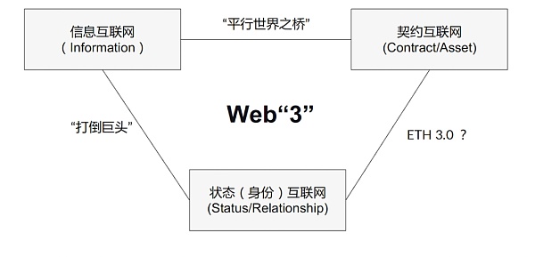 我们寄予厚望的 Web3 世界,应该是一个有可以无限输入输出的“信息互联网”(Information Network),有可以承载“资产”、实现价值流转的“契约互联网”(Asset Network),和能够安放我们的灵魂、身份、信用和社会关系,解决“我是谁、我拥有什么”的“身份互联网”(Status Network)。