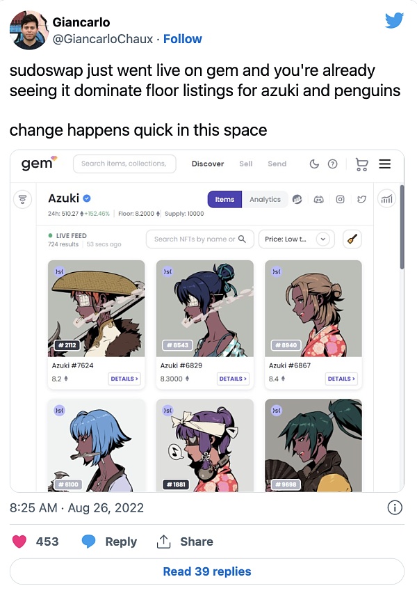 1.主流的聚合器打算在不久的将来提供类似的功能,这句话只说了一半。这里的「主流的聚合器」应该就是指 GEM. 就在同一天,GEM 集成了 sudoswap, 热门项目地板价全部被 sudoswap 占领,这会大大削弱 x2y2 竞争力。x2y2就是 GEM 起家的,必须要以某种方式跟进。有趣的是,GEM 集成了 sudoswap 我并没有在这 2 个官方推特账号下看到,猜测应该是低调测试用户反应