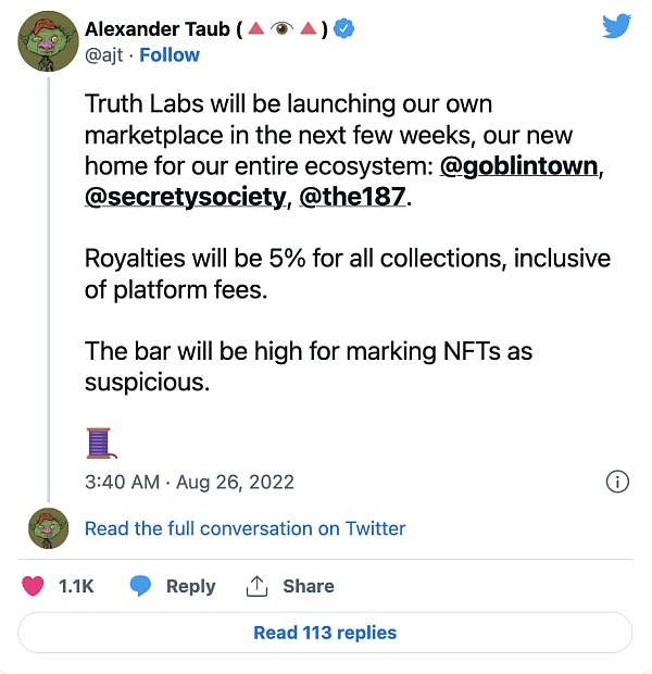 Truth Labs 的联合创始人 ? ? Alexander Taub 在推特上宣布将于几周内推出goblintown.wtf生态 NFT 交易市场,更好的规范版税、平台费用和可疑 NFT,建设自己的生态