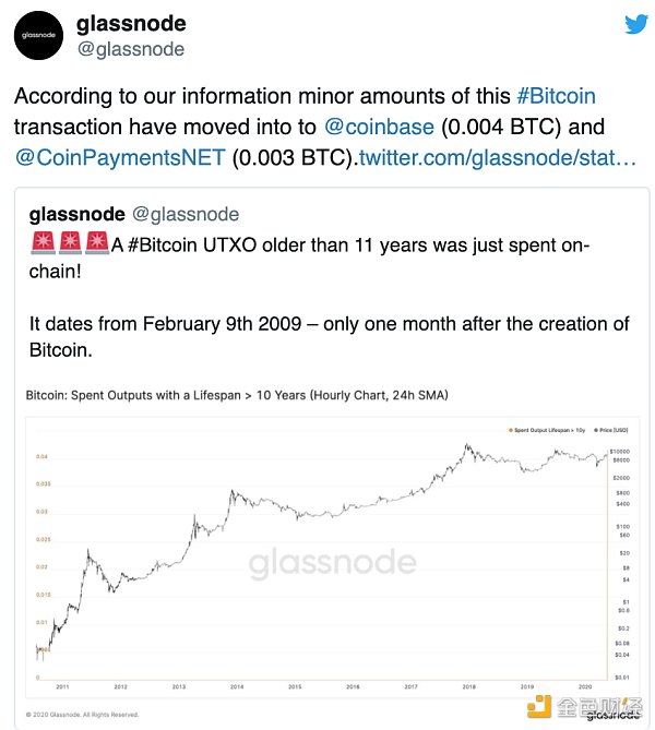 5月20日,2009年2月产生的远古比特币地址17XiVVooLcdCUCMf9s4t4jTExacxwFS5uh转出了约50个比特币引发市场关注。
