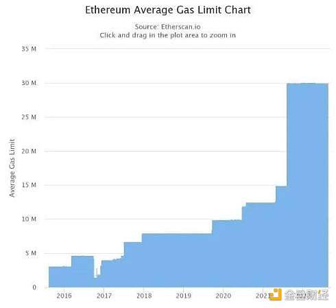 以太坊平均 gas 限制图表显示了以太坊网络的历史每日平均 gas 限制(2016 年至今)。与最大区块大小为 1 MB 的比特币不同,以太坊在技术上没有最大区块大小(矿工可以集体增加或减少以太坊的区块 gas 限制)。然而,限制每个区块消耗的 gas 有助于管理以太坊区块链的增长以及运营矿工或节点的成本。图片来源:Etherscan