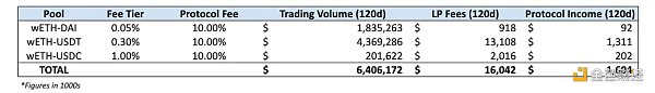 在过去 120 天,三个池的交易量合计为 64.1 亿美元,为 LP 产生了大约 1604 万美元的费用。如果打开费用开关之后,Uniswap 将获得 160 万美元的协议收入,或者年化为 487 万美元。