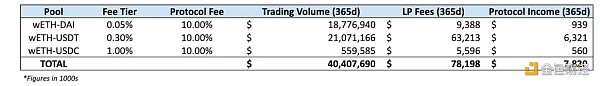 到目前为止,最大的费用贡献者是 WETH-USDT 池,在此期间它贡献了 80.8% 的协议收入,同时这三个矿池也分别占了 Uniswap 总交易量和费用的 5.69% 和 6.47%。