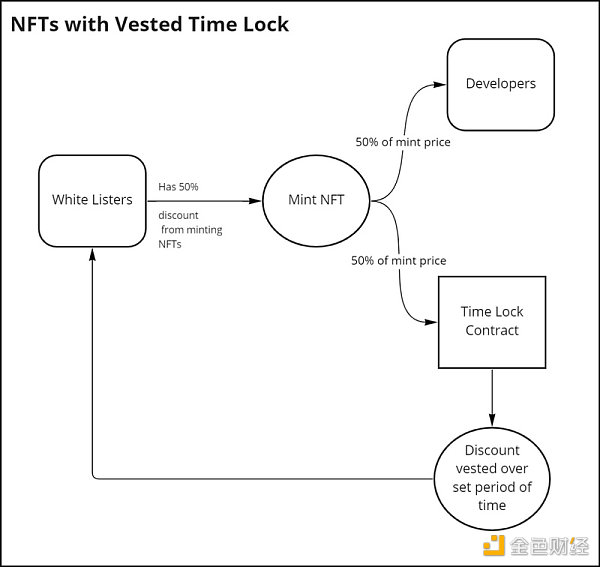 例如,一个 NFT 需要 1 个 ETH ,该项目为支持该项目的白名单用户提供 50% 的折扣。在这些白名单用户 Mint 了 NFT 后,所述的 NFT 将进入锁仓合约,在初始锁定时(给定的 NFT 项目)将向开发者发放 0.5 ETH(每个生成的 NFT)。然后,白名单用户必须等待断崖锁仓期(NFT 被锁定的最短时间)结束。