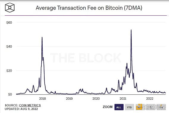 如果 BTC 价格在减半周期左右下跌,安全性下降将更加显著,并可能触发前面提到的负反馈循环。只要价格受到限制,这种安全系统从根本上是不可持续的。解决这个问题的唯一方法是产生有意义的费用收入。这笔费用收入可以取代部分发行,并继续为矿工提供激励,确保即使在发行减少后也能提供安全保障。而现实是比特币网络的费用收入在很长一段时间内都很低微,而且还处于下降趋势。