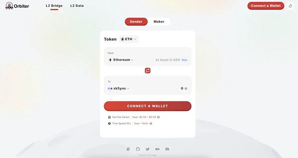 第一步是使用Orbiter Finance将资金转到zkSync。Orbiter是一个跨链桥,支持来自各种区块链的ETH、USDC和USDT转账。