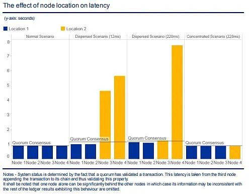 该分析证实了众所周知的网络规模和性能之间的权衡。增加节点的数量导致了支付执行时间的增加。此外,节点之间的距离对性能的影响取决于网络配置:只要达到共识所需的最小节点数(法定人数)足够接近,那么在网络的其他部分的分散对延迟的影响是有限的。尽管如此,网络外围的节点仍可能会产生与法定人数不一致的情况。如果法定人数足够分散,对延迟的影响就会更大。