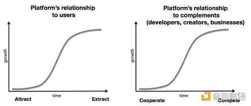现有社交平台掌控叙述,致使用户毫无权力,几乎沦为电子领域的奴隶。就像 Chris Dixon 所说,尽管平台大获成功,但是它与网络用户的关系从正和转为零和,从吸引转为榨取。同时,用户放弃平台比平台放弃用户的成本要高得多——这就是一种危险的不对等。