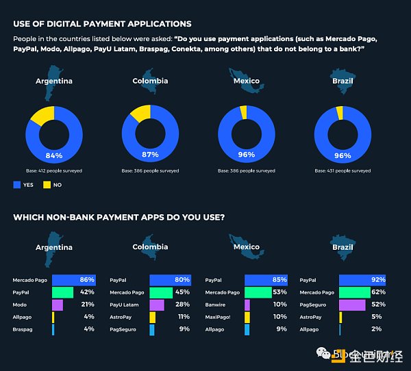 数字支付的普及并不局限于上述的国家:98%的巴西银行客户,94%的墨西哥和哥伦比亚银行客户,以及89%的阿根廷银行客户表示经常使用在线支付(来源:Rapyd,第7-10页)。这一趋势也不仅限于银行提供的服务,该地区非银行支付应用的使用率也极高。96%的墨西哥人和巴西人、87%的哥伦比亚人和84%的阿根廷人经常使用PayPal、Modo和MercadoPago等应用程序(Rapyd,第6页)。我将这些数据简单地说出来:拉美裔已经很大程度上在传统银行系统的范围之外运作。