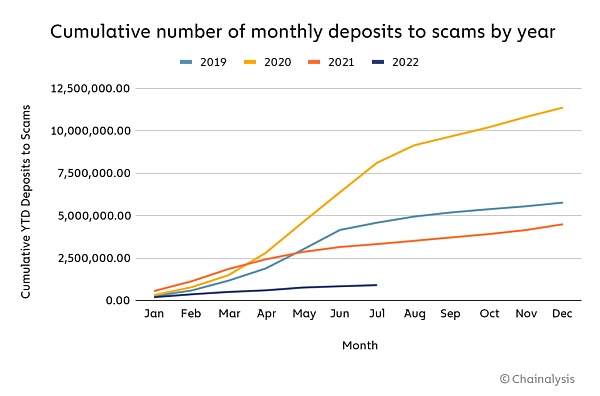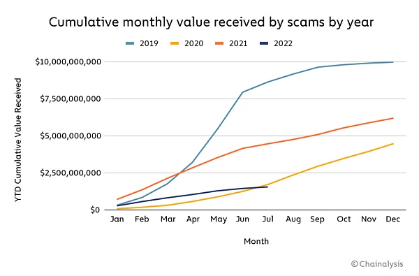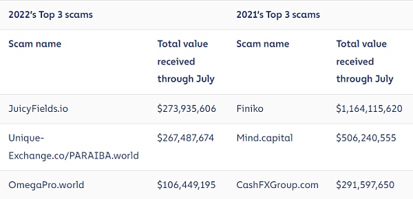 同样重要的是要记住,收入通常是由大型局所驱动的,例如 PlusToken,它在 2019 年从受害者那里取了超过 20 亿美元,或者 Finiko,它在 2021 年取了超过 15 亿美元。截止 2022 年 7 月,今年还没有发现任何可以接近这两者水平的大型局。