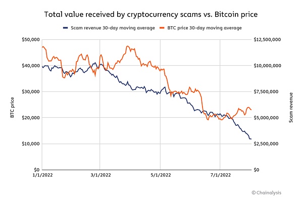 这些数字表明,陷入加密货币局的人数比以往任何时候都少。造成这种情况的一个原因可能是,随着资产价格的下跌,加密货币局(通常是承诺具有巨额回报)对潜在受害者的吸引力降低。此外,由于加密货币价格正在下跌,更有可能陷入局的新用户、缺乏经验的用户在市场上并不那么普遍。