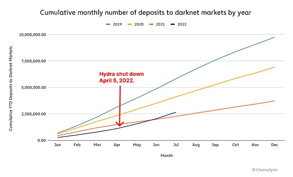 有趣的是,虽然 Hydra 关闭后整体暗网市场收入下降,但其余市场的交易量显著增加。