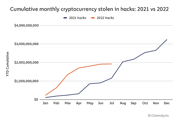 到 2022 年 7 月,有价值 19 亿美元的加密货币被盗,而 2021 年同一时间点不到 12 亿美元。这种趋势似乎不会很快逆转,因为 8 月的第一周又发生了两件事:代币跨链桥 Nomad 被黑客盗取了 1.9 亿美元资金;黑客从 8,000 多个 Solana 钱包盗取了 500 万美元的资金。(这两个事件在上图中没有显示,因为我们选择了 7 月 31 日作为我们研究的截止点)。?